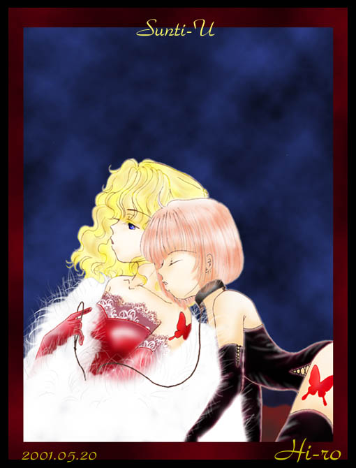 WBAAのひろ様より、サイト一周年記念のフリー画像として提供して頂きました♪ なんか……見れば見るほど凄い雰囲気なお二人で(笑)。 ひろちゃんの元絵が可愛いだけに、絵本の中のような不思議な色っぽさが漂ってますね。 本当に、ありがとう☆